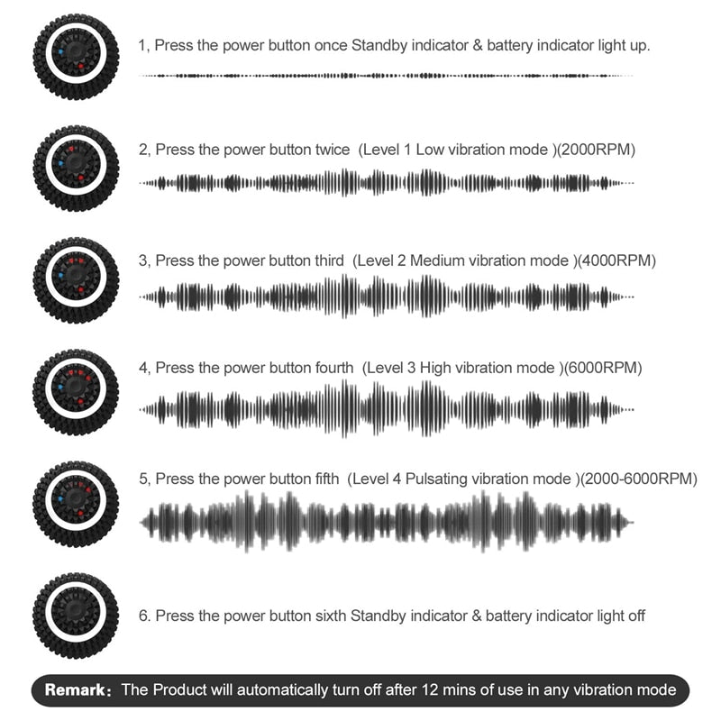 4 Level Vibration Mode-Enhance your Pre-workout and Recovery system with Foam roller Low/Medium/High/Pulsating Vibration Modes at your choice.perfect for warming up,circulation improvement and recovery of sore and tight muscles Rechargeable&Ultra-Portable-With only 3.9inch diameter and 0.79lbs,light-weight and compact therapy ball is so portable that you can bring to anywhere you like for relaxation,best comp for your camping trip,training,yoga or fitness Washable-All Surrounded by silicone,the waterproof grade is IP65,you can wash the massage ball directly,but don't left in water for a long time Pain Reduction-Massage ball gives you access to hard to reach pain points and provides relief,Trigger Point Therapy and relaxation,It works to massage and relieve your back,hips,legs,arms,waist,and feet Charging time:about 4 hours Motor operating temperature:65 ° C Colour:Black Material:ABS+silicone Package Contents: 1* Electric Massage Ball 1* USB line 1* Instruction manual Only the above package content, other products are not included. Note: Light shooting and different displays may cause the color of the item in the picture a little different from the real thing. The measurement allowed error is +/- 1-3cm. Electric Massage Ball